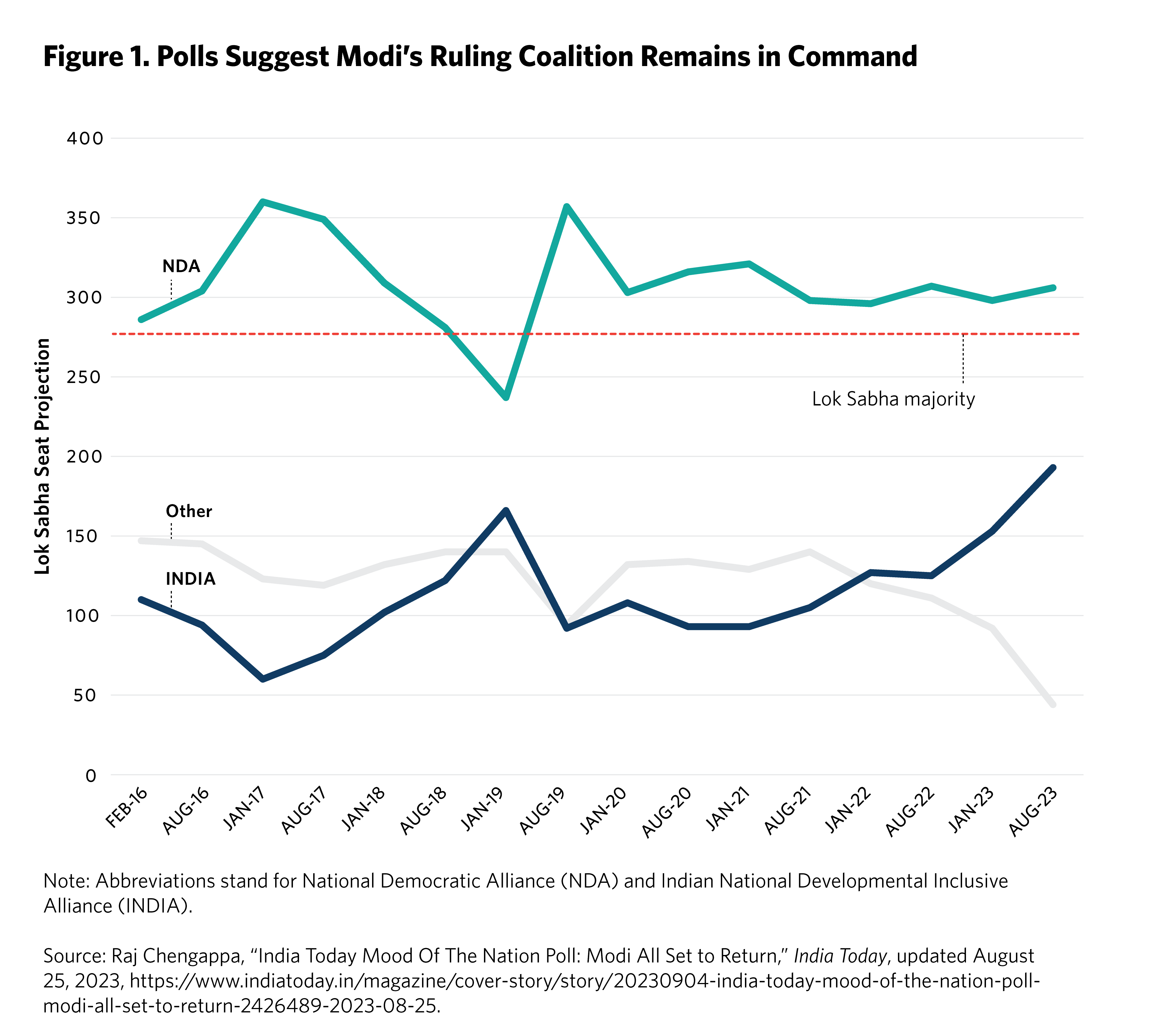 Domestic opinion polls confirm that Modi’s popularity remains intact and that this continues to fuel his party’s dominance. The biannual Mood of the Nation poll from India Today has consistently shown, including as recently as August 2023, that the BJP-led National Democratic Alliance (NDA) would handily capture a majority of seats in the Lok Sabha, even if its majority reduces compared to its 2019 tally (when it notched 353 seats, shown in figure 1).